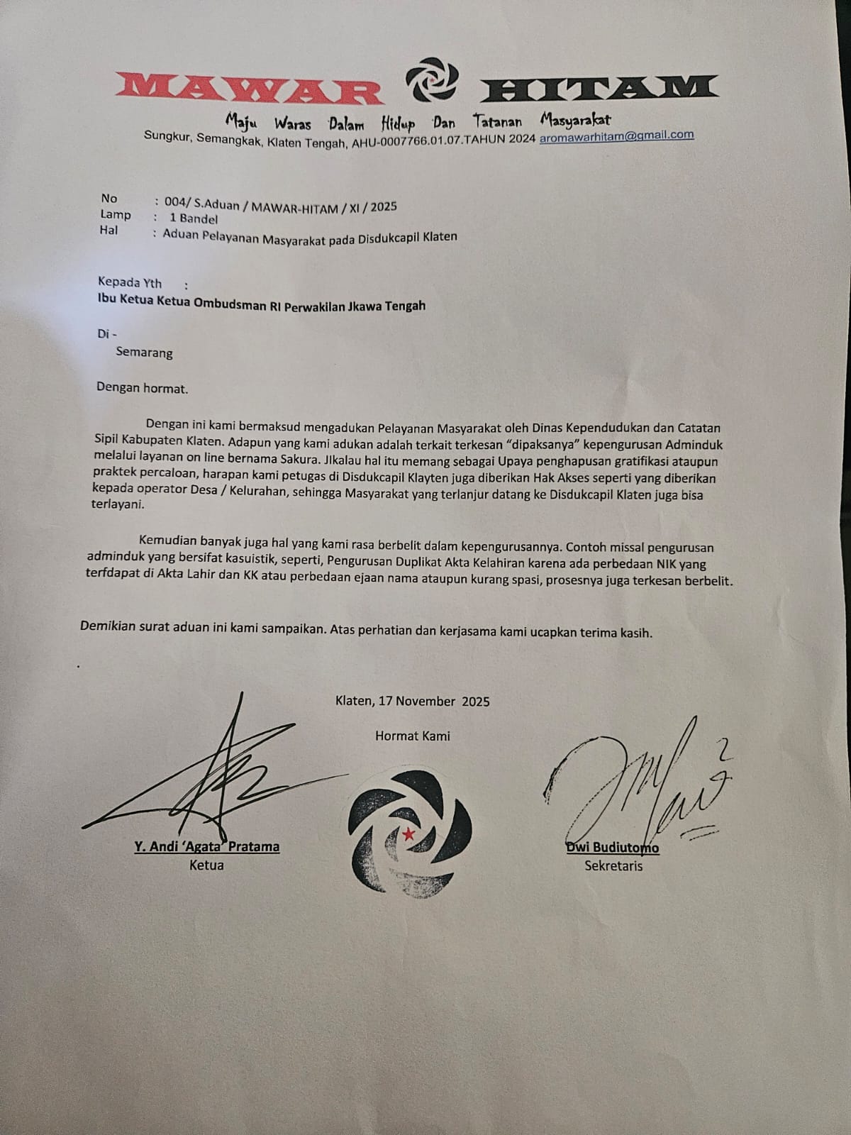 Layanan Berbelit, Mawar Hitam Adukan Disdukcapil Klaten Ke Ombustmand